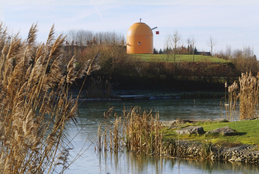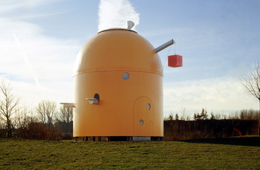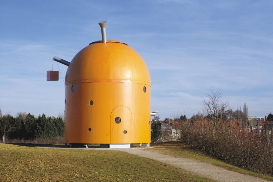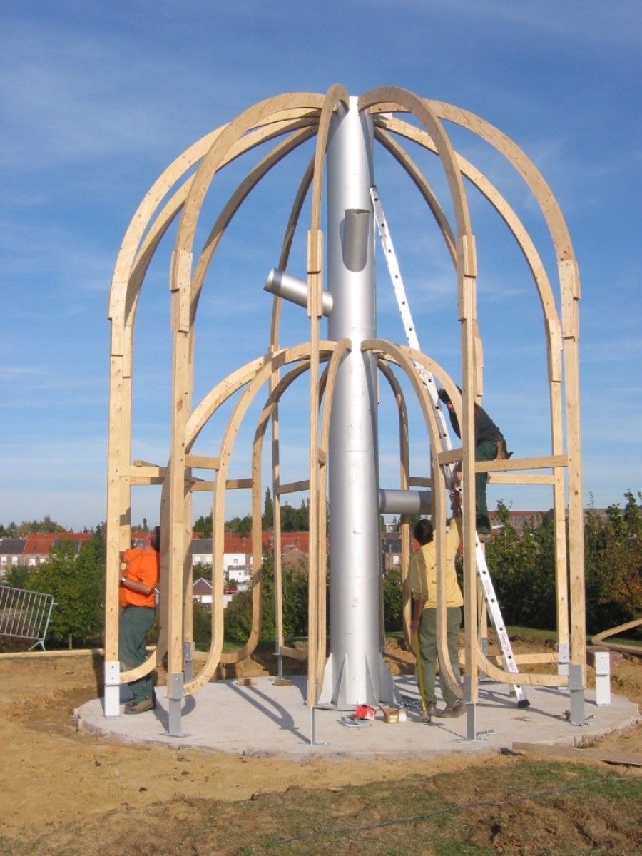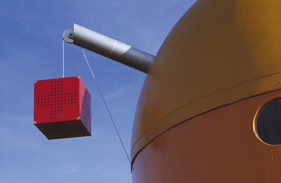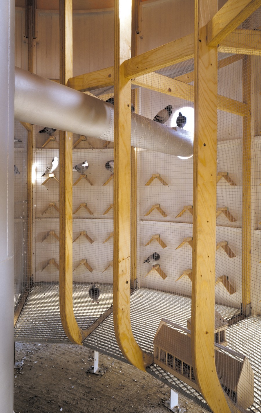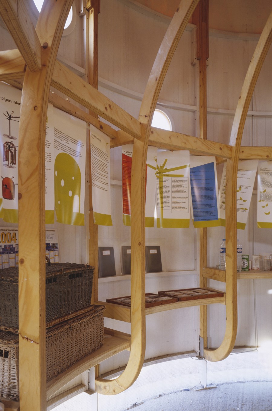 Soucieuse dans ses créations d’allier tradition et modernité, matali crasset conçoit une forme en capsule en référence aux pigeonniers de la haute antiquité égyptienne. La structure interne, à partir de laquelle peut s’organiser la mise en place des différents espaces fonctionnels, évoque celle d’un arbre, reposoir naturel des volatiles, axis mundi reliant terre et ciel. La coque externe, enveloppe protectrice entre intérieur et extérieur, laisse présager d’un univers secret à découvrir, invitation pour le public à entrer dans cette architecture inédite. Forme simple et colorée, la capsule se détache nettement sur l’espace où elle se déploie sur une hauteur de plus de six mètres. Surélevée, comme en suspension, elle évoque l’idée de départ, l’envol, forme aérodynamique évocatrice d’un univers futuriste et ludique, support pour l’imaginaire s’abandonnant au monde des pigeons voyageurs.