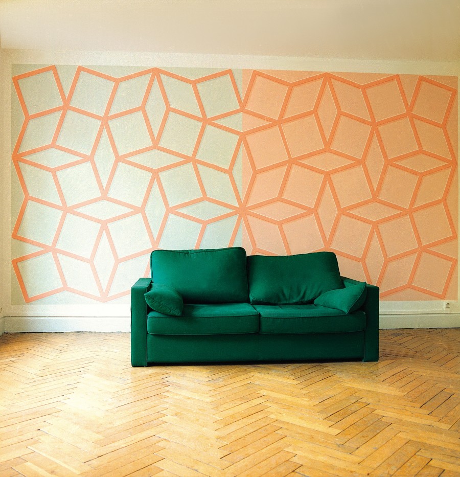 Dans le travail présenté à artconnexion, une peinture au pochoir sur le mur, l’orientation est autant sur le motif que sur la composition active picturale, à la fois linguistique et sensuelle.